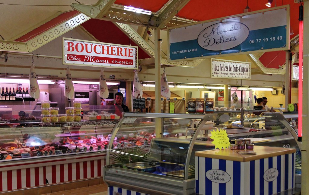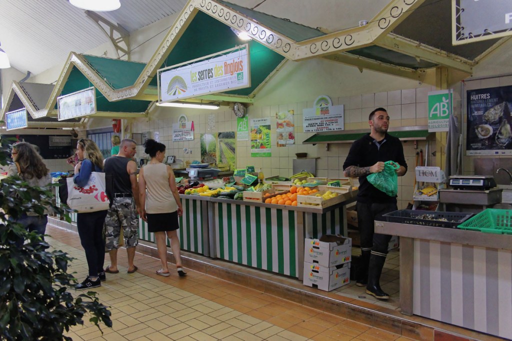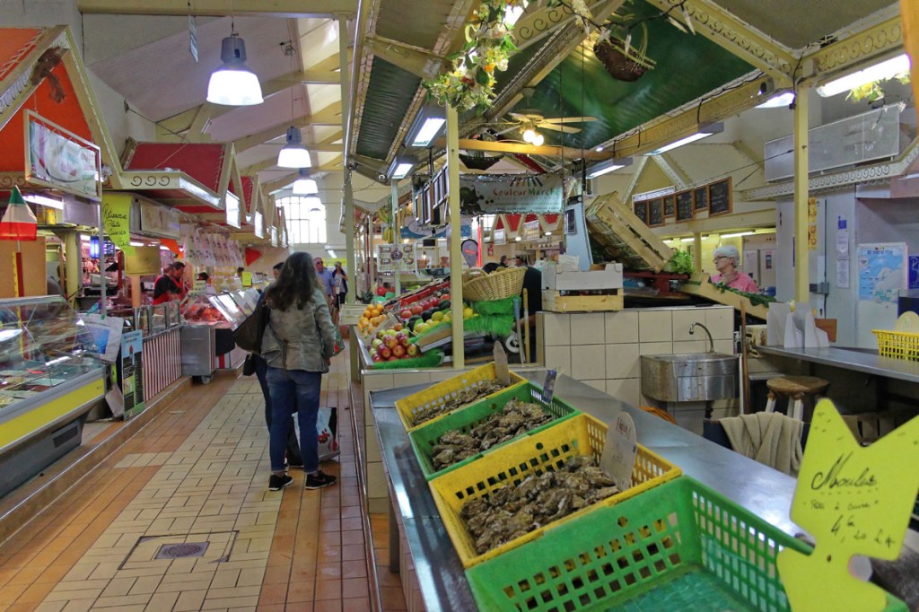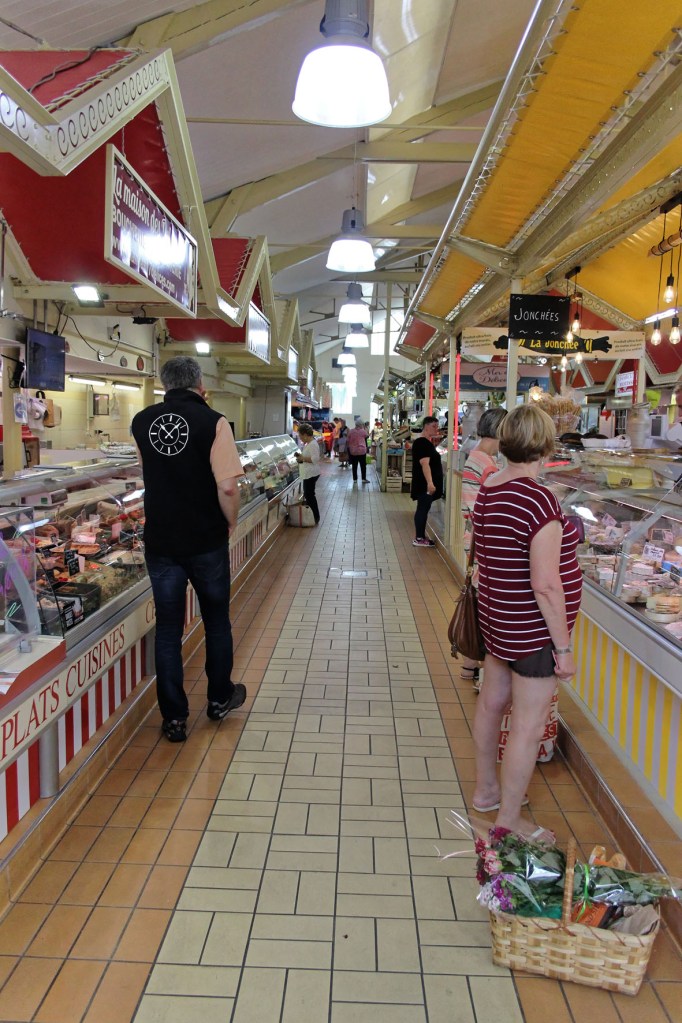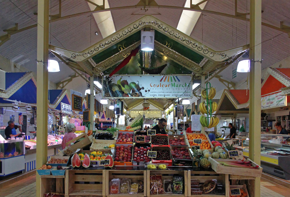 Maar dit is een overdekte markten blog, dus gaan we terug naar de markt. Het is eerder een kleinere, maar knusse marktplaats die enige gezelligheid uitstraalt. Het gebouw zit aan de voorzijde geprangd tussen de bakkerij en de apotheker. De kleurige letters die gebruikt zijn voor de woorden ‘Marché Couvert’ boven de hoofdingang doen me onverwijld denken aan de vintage magneetlettertjes die bij de Fisher Price lessenaar hoorden. Het geeft de toegang tot deze markt iets speels en kinderlijk. Het hoeft niet altijd even serieus te zijn, ook niet op markten. De kleurigheid van de letters wordt doorgetrokken in de markt zelf.