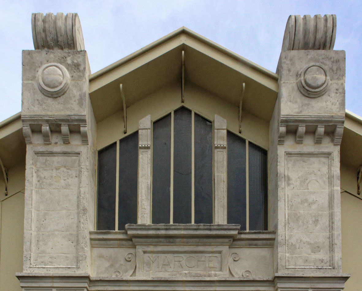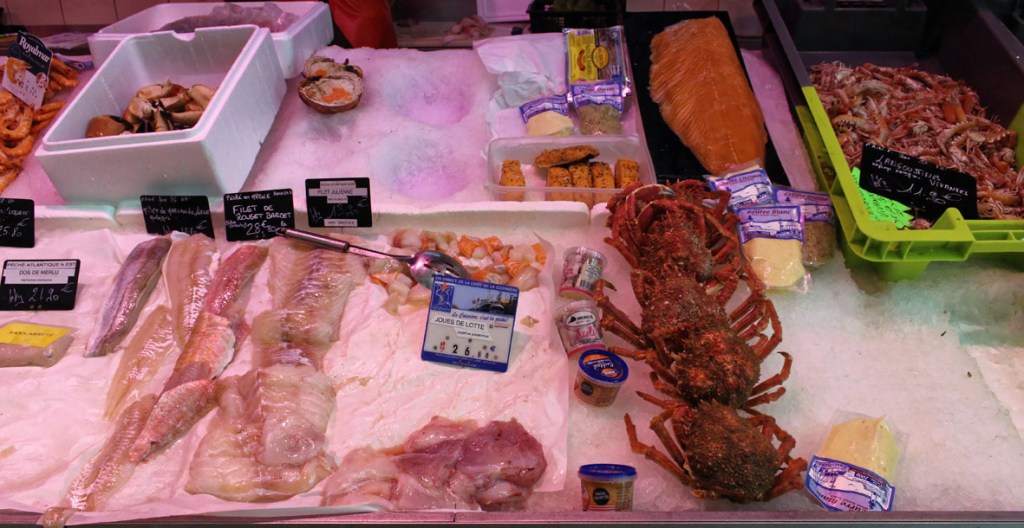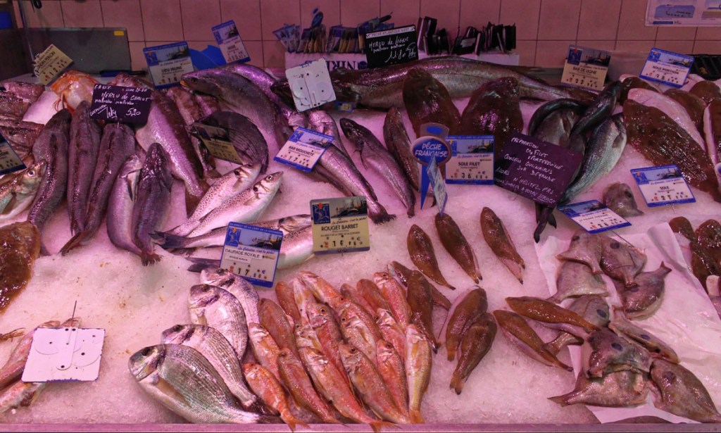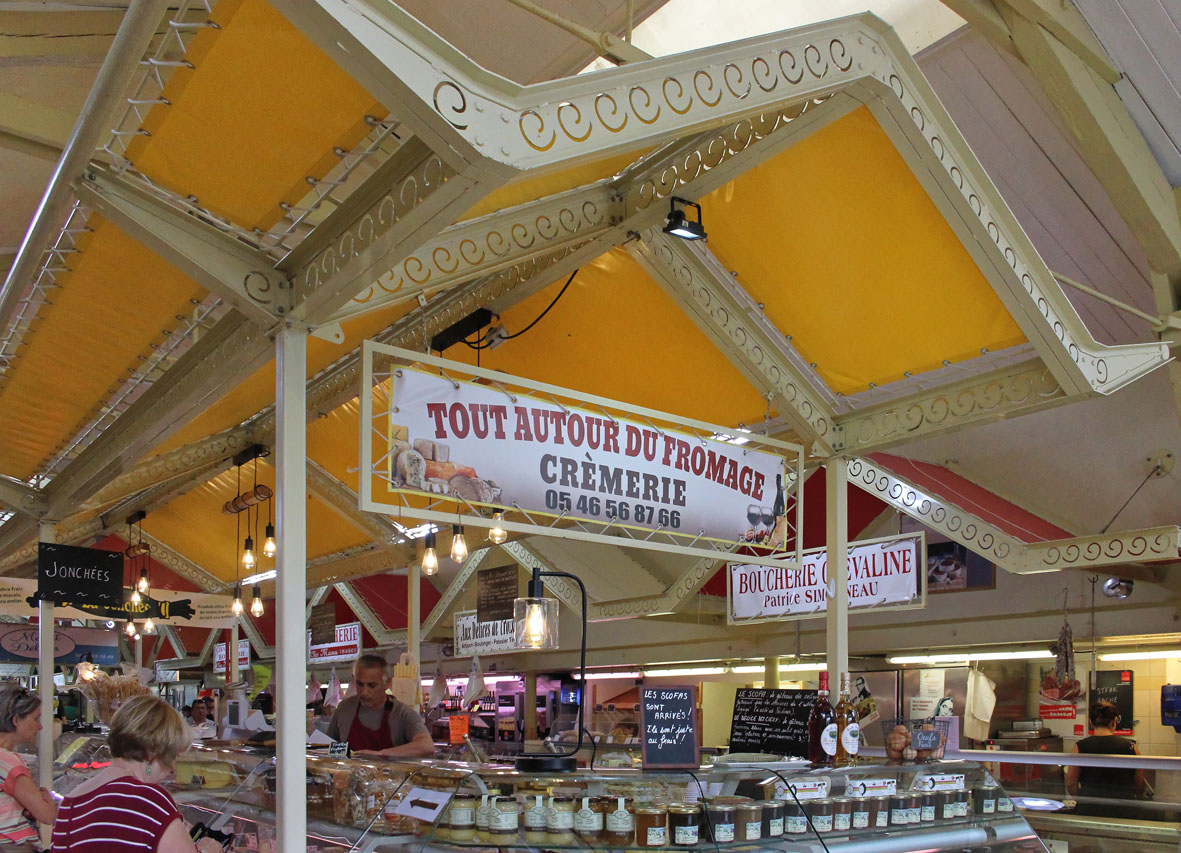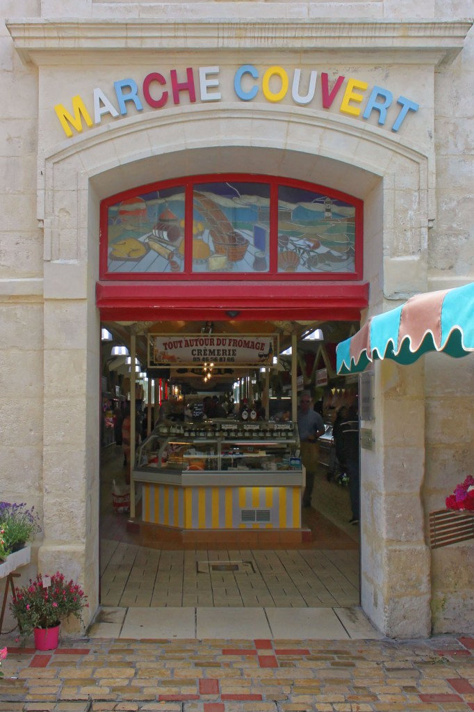 Maar dit is een overdekte markten blog, dus gaan we terug naar de markt. Het is eerder een kleinere, maar knusse marktplaats die enige gezelligheid uitstraalt. Het gebouw zit aan de voorzijde geprangd tussen de bakkerij en de apotheker. De kleurige letters die gebruikt zijn voor de woorden ‘Marché Couvert’ boven de hoofdingang doen me onverwijld denken aan de vintage magneetlettertjes die bij de Fisher Price lessenaar hoorden. Het geeft de toegang tot deze markt iets speels en kinderlijk. Het hoeft niet altijd even serieus te zijn, ook niet op markten. De kleurigheid van de letters wordt doorgetrokken in de markt zelf.