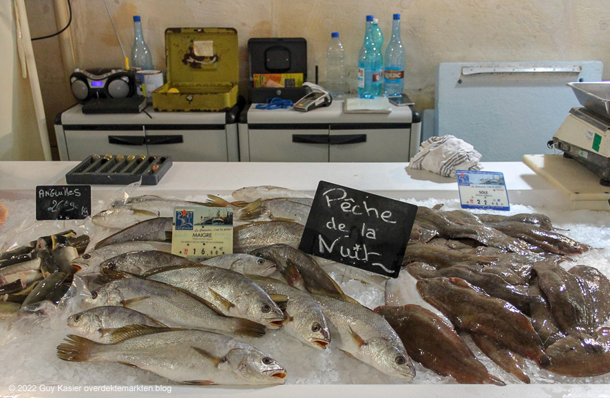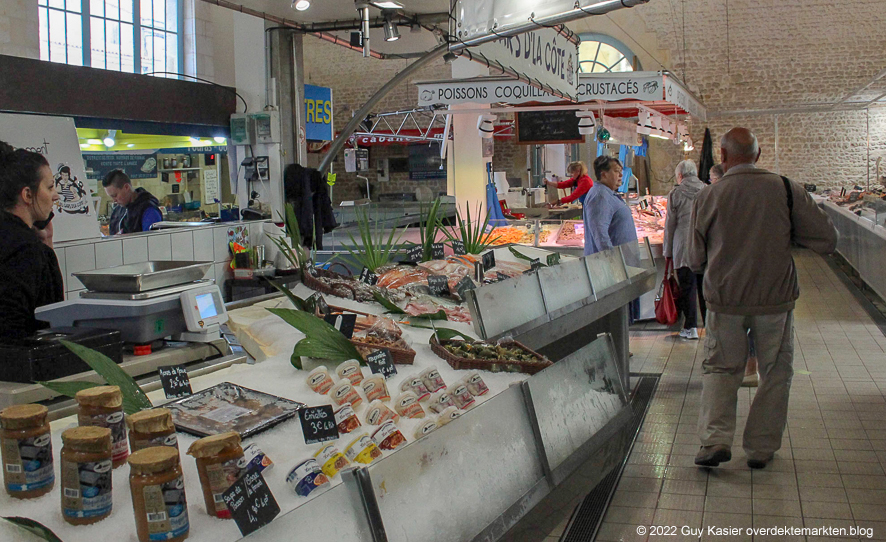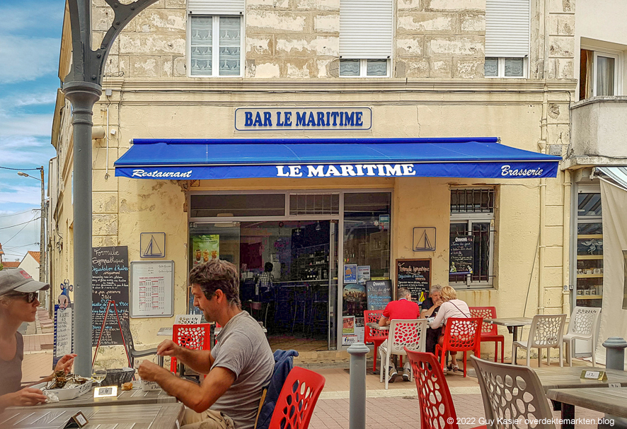 Aan de voorzijde van de vishall is er een overdekt terras. Dat wordt gebruikt door de Bar Le Maritime aan de overkant van de straat. Je kan er iets drinken en eten. Speciaal is, dat, wanneer je oesters of vis bestelt, de waard je enkele plastic bakjes geeft en je vraagt de oesters en de vis zelf te gaan kiezen in de vismarkt. Terwijl je naderhand de oesters opslurpt, wordt de gekozen vis vakkundig klaargemaakt in de bar. Zalig toch?